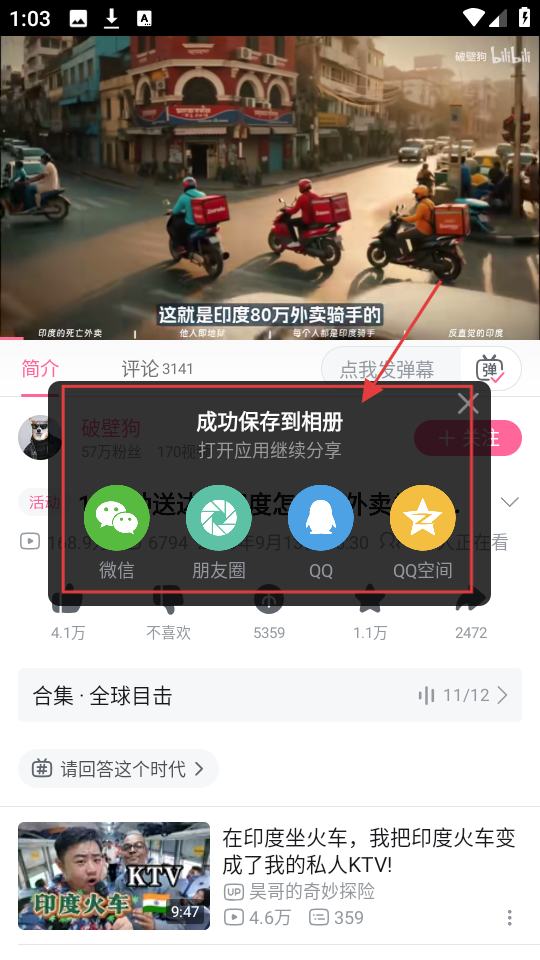 4、完成下载后,视频会成功保存,还能选择微信、QQ等方式分享,方便又快捷呢。