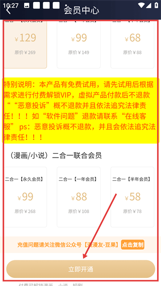 3、在会员中心选择想要开通的会员套餐,点击底部【立即开通】,进入收银台界面哦。
