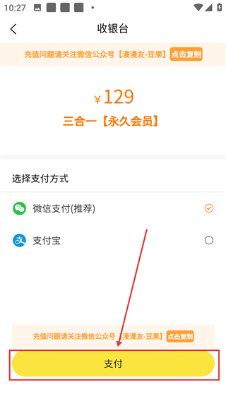 4、在收银台选择支付方式后,点击【支付】,即可完成会员套餐的购买流程啦。