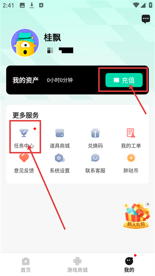 2、在个人中心,点【任务中心】能做任务领奖励,点【充值】可进入充值页面啦。