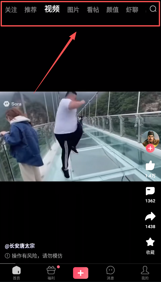 2、登录后进入主界面,上方可切换关注、推荐、视频等内容频道,下方导航栏能直达首页、福利、消息和个人中心。