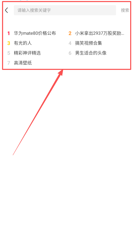 3、需要查找内容时,点击顶部搜索框,输入关键词或直接浏览热门搜索榜单,如华为mate80价格、搞笑视频合集等。