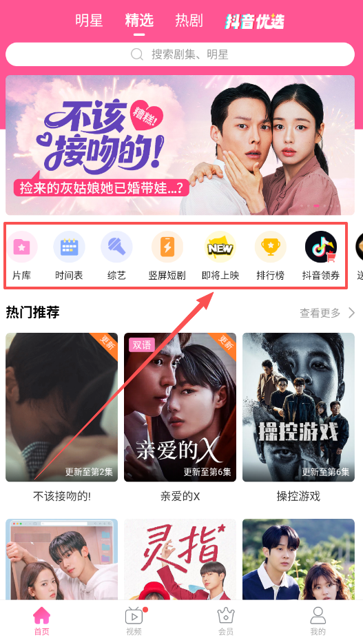 2、想找特定内容,可以使用顶部的搜索框,直接输入剧名或明星,或者通过“片库”、“精选”等分类标签进行浏览。