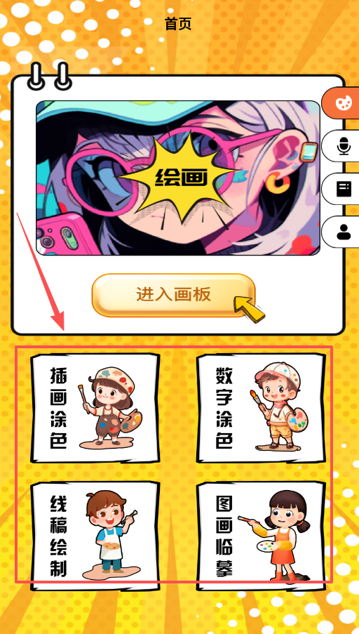 1、打开软件首页,你会看到绘画、插画涂色、数字涂色等入口,想自由创作就点“进入画板”。