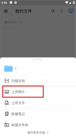 2、进入文件夹后点击底部加号,在弹出菜单里选择【上传照片】选项,就能进入选图页面哦。