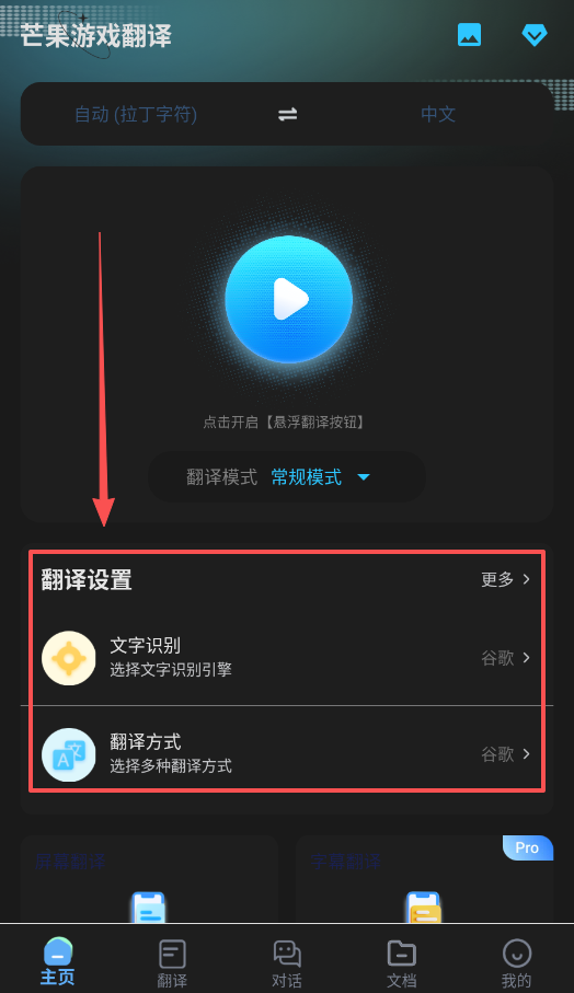 1、先从主界面选择需要的翻译模式,常规翻译用于简单文本,屏幕翻译适合实时应用,选好语言方向后,就可以开始使用了。
