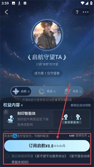 3、在订阅界面,可看到【订阅启航¥8.8】按钮,勾选协议后就能开启订阅流程呢。