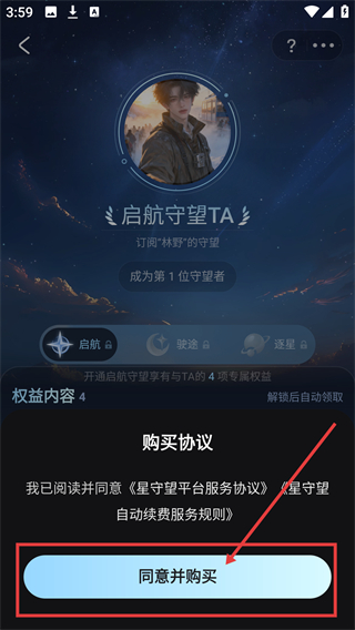 4、确认订阅时,点【同意并购买】,就能完成支付,解锁该角色的专属守望权益哦。