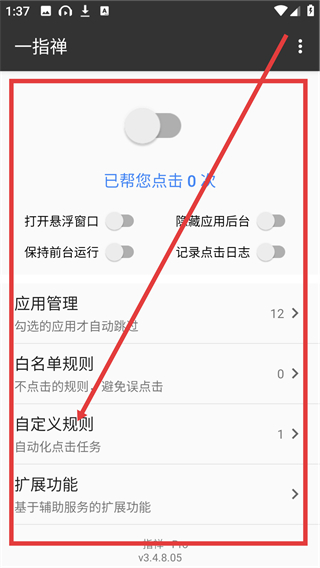 1、在一指禅主界面点【自定义规则】选项,能进入规则配置界面,后续可添加自动化点击任务啦。