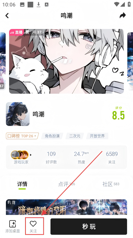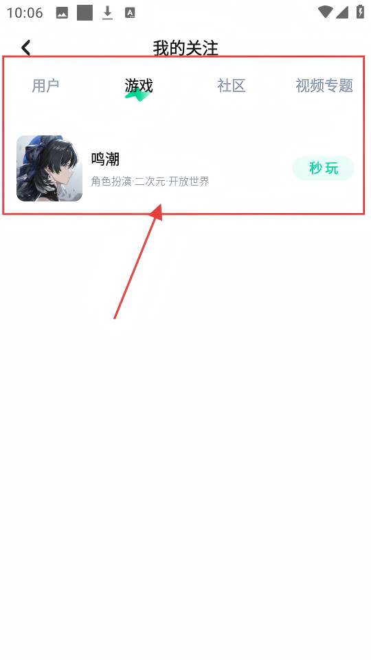 4、进入我的关注页面,能看到关注的游戏,比如【鸣潮】,点它就能快速进入游戏详情页啦。