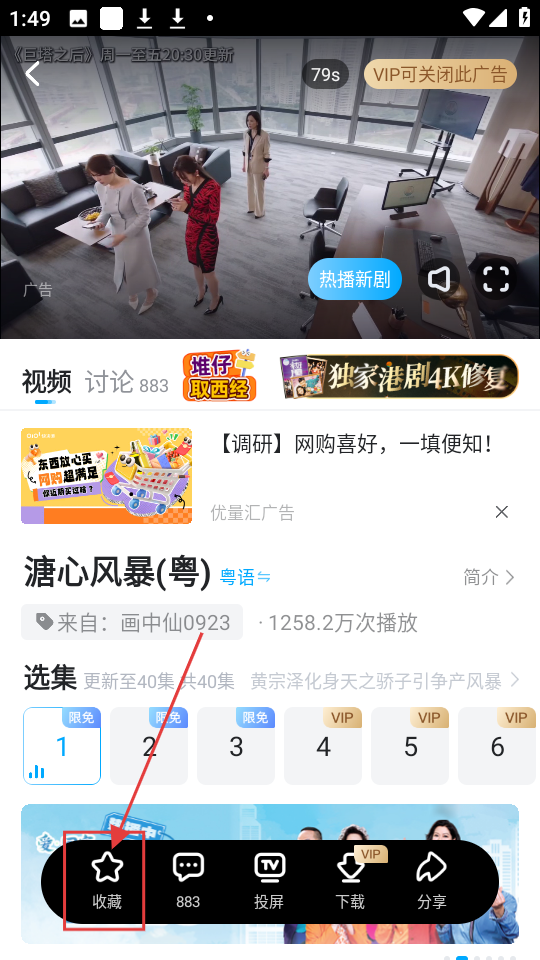 2、进入剧集播放页面后,下方有好多功能按钮,若想收藏剧集,就点击【收藏】按钮,超简单的呢。