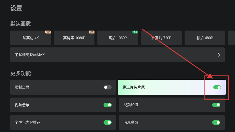 3、在设置界面的“更多功能”板块,我们能看到【跳过片头片尾】选项,它当前是关闭状态。