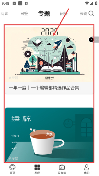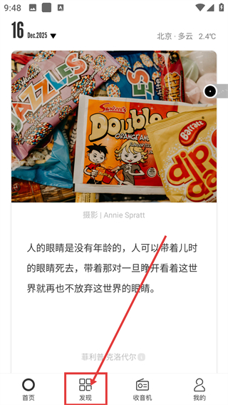 1、在首页点击底部的【发现】选项,就能进入发现页面,找到专题、日签等丰富内容板块啦。