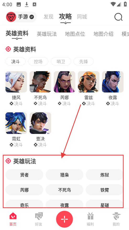 2、在攻略板块点击【英雄玩法】,就能查看各英雄的玩法介绍,选择感兴趣的英雄啦。