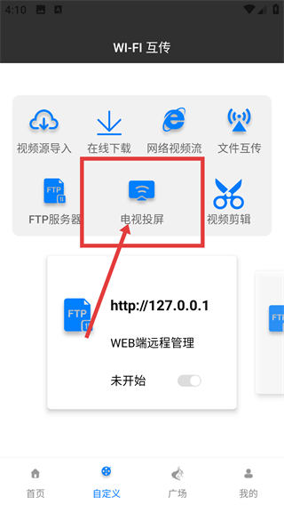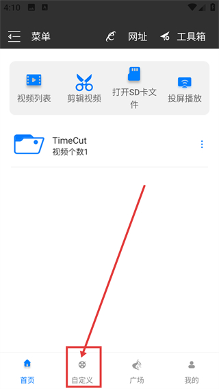 1、在首页点底部的【自定义】选项,能进入自定义功能界面,后续可找到电视投屏等工具啦。