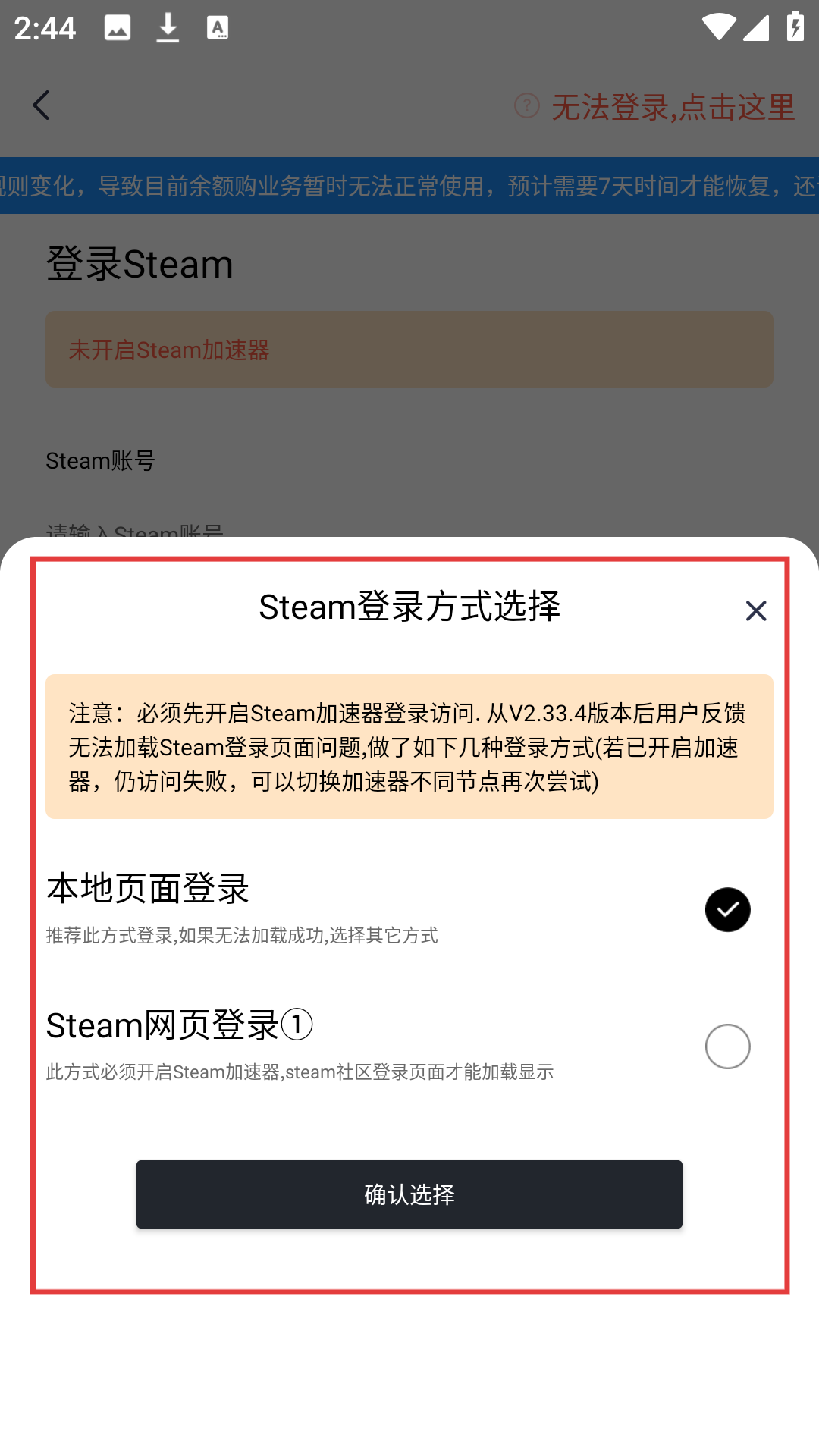 4、若登录遇到问题,可选择Steam登录方式,如本地页面登录或Steam网页登录,点击【确认选择】,即可继续登录操作哦。