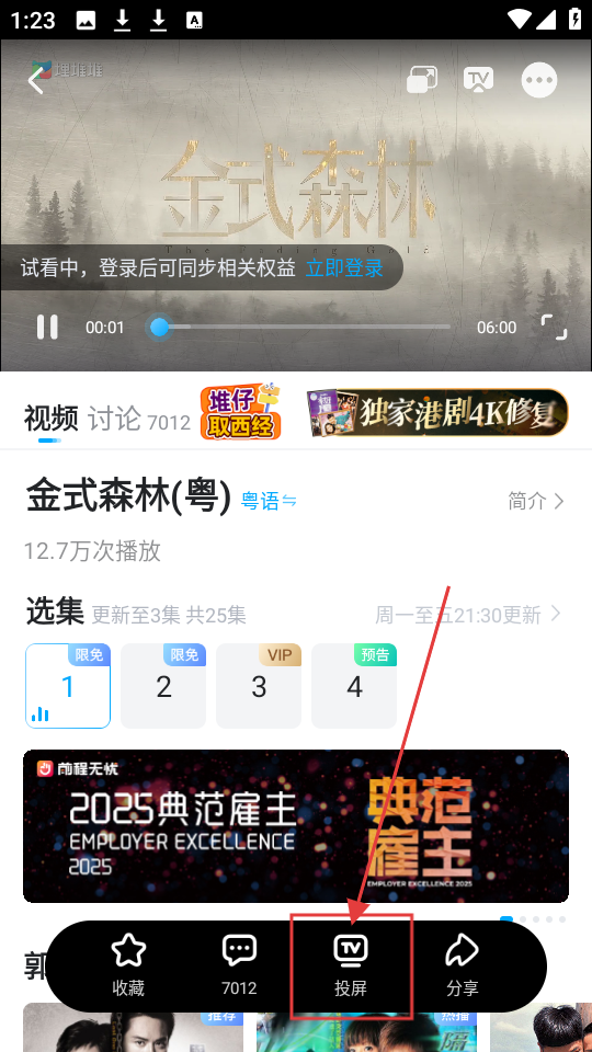 2、进入播放页面,若想投屏观看,点击【投屏】,就能尝试投屏操作哦。