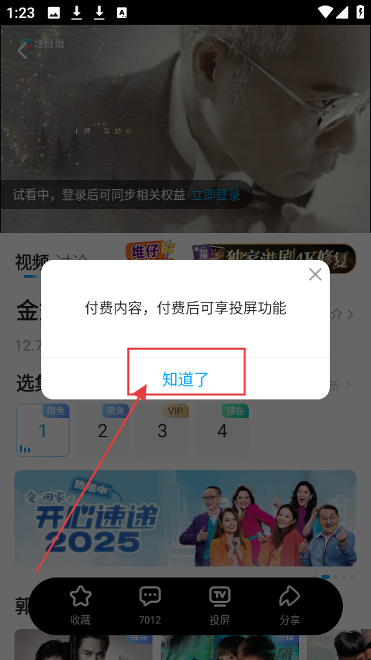 3、若投屏功能需付费,会弹出提示框,点击【知道了】,关闭提示框即可啦。