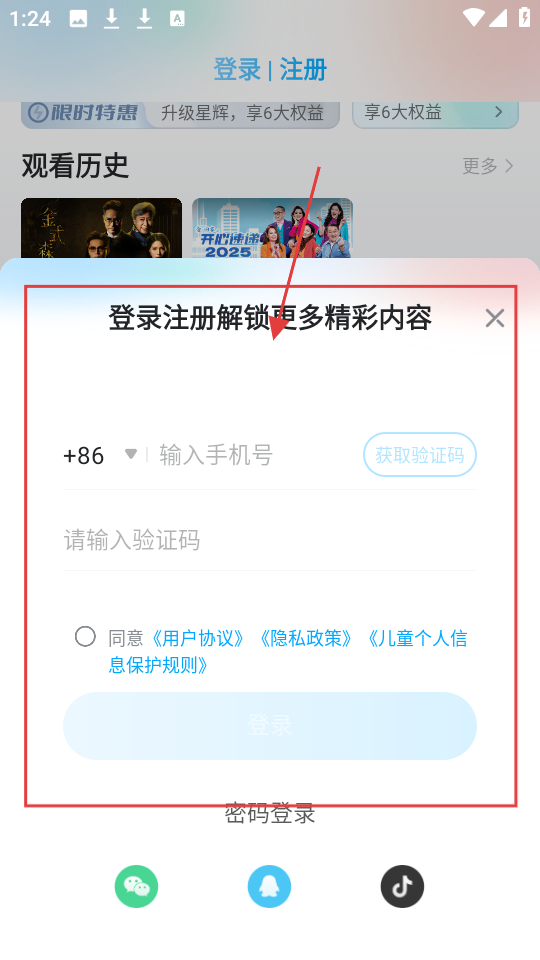 4、若想解锁更多内容,需登录注册,在登录页面输入手机号、验证码,点击登录,就能完成操作呢。