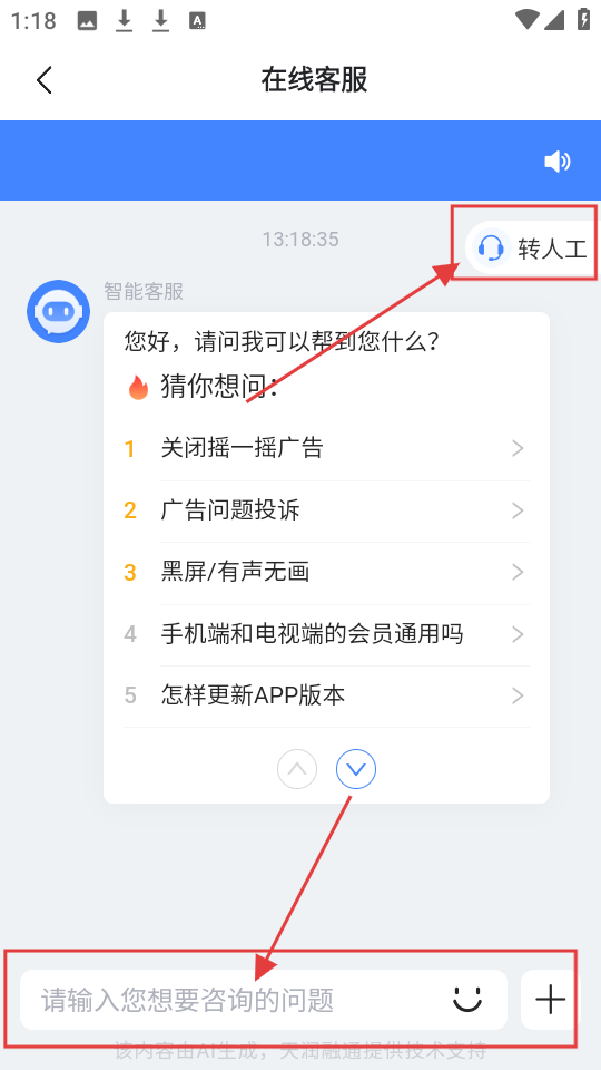4、在在线客服界面,可输入问题咨询,若需要人工客服,点击【转人工】按钮即可,方便解决问题啦。
