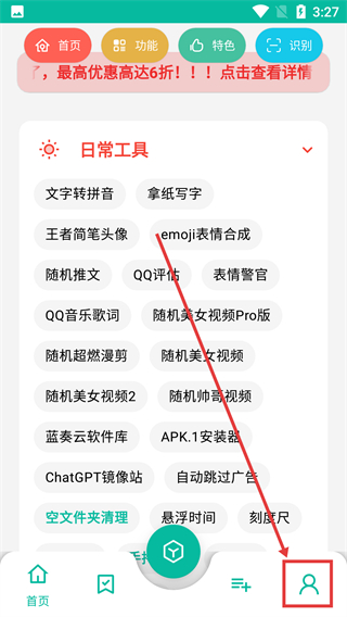 1、在工具应用首页,点底部右侧的【我的】选项能进入个人中心页,可处理账号相关的操作哦。