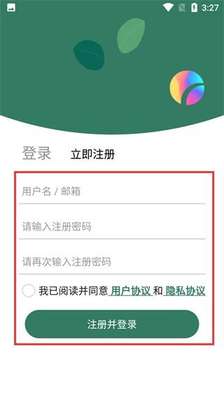 4、在注册界面,填写【用户名/邮箱】等信息并勾选协议后,点【注册并登录】就能完成账号注册啦。