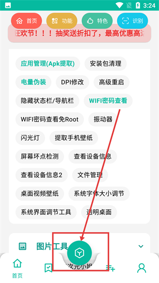1、在宇宙工具箱首页,点击底部的功能扩展按钮,就能打开更多工具的分类页面啦。