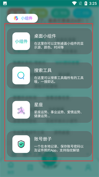 2、进入扩展工具页后,可看到【桌面小组件】【搜索工具】等功能,选择对应选项就能进入功能页哦。
