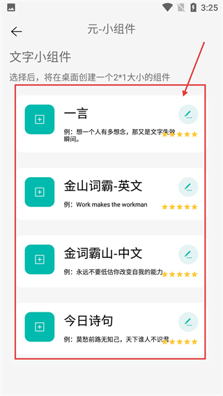 3、进入元-小组件页,能看到【一言】【金山词霸-英文】等文字小组件,点击对应选项可添加到桌面啦。