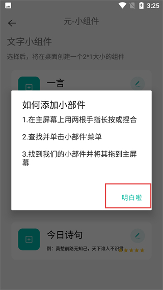 4、点击添加组件后会弹出添加教程,看完后点击【明白啦】,就能按教程将组件添加到桌面啦。
