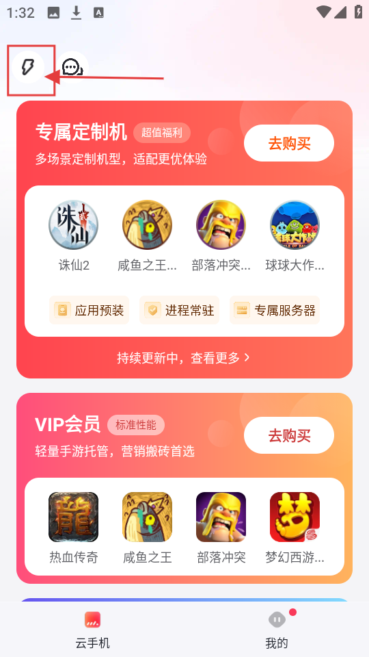 1、在云手机页面,点击左上角闪电图标,就能进入选择加速游戏的界面啦。