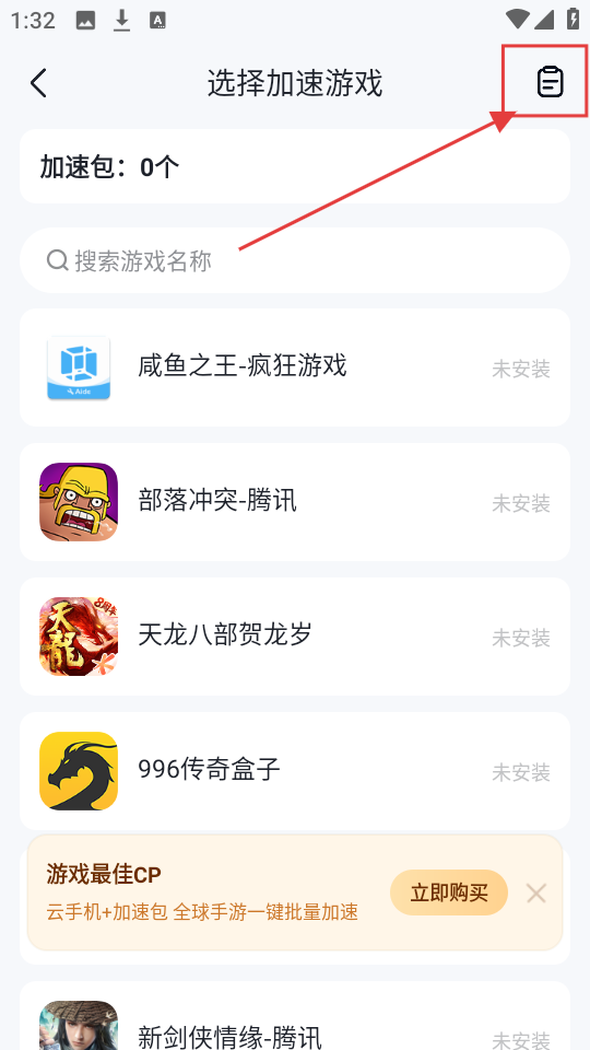 2、进入选择加速游戏界面后,点击右上角类似列表的图标,可查看我的加速包情况哦。