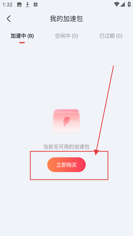 3、在我的加速包页面,若没有可用加速包,点击【立即购买】按钮,就能进入加速包购买界面啦。