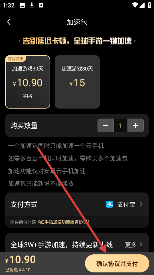 4、进入加速包购买界面,选好加速包类型和购买数量,再选支付方式,最后点【确认协议并支付】就能购买啦。