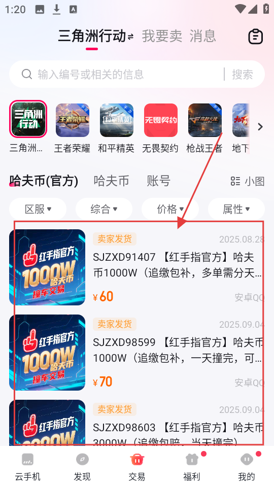 2、进入交易页面后,我们能看到《三角洲行动》等游戏相关的商品,挑选感兴趣的商品。