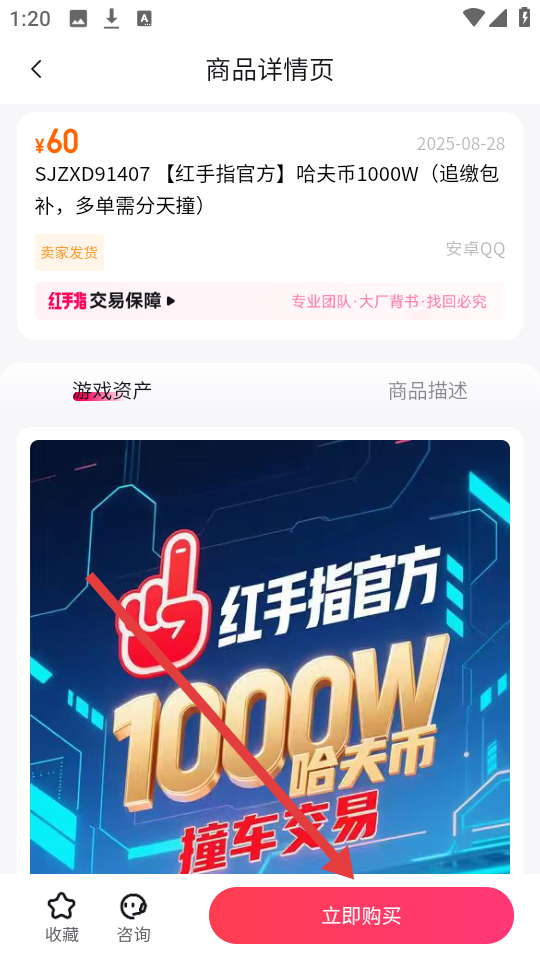 3、选中心仪的商品,比如红手指官方的哈夫币商品,点击【立即购买】,就进入商品详情页准备购买。