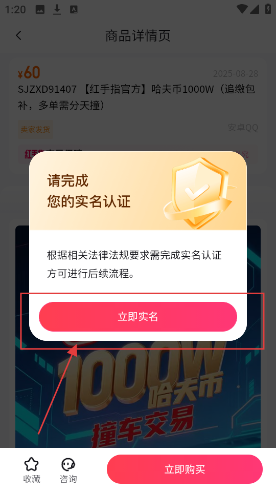 4、点击购买后,会弹出需完成实名认证的提示,我们点击【立即实名】,按要求完成实名认证,才能继续购买流程。