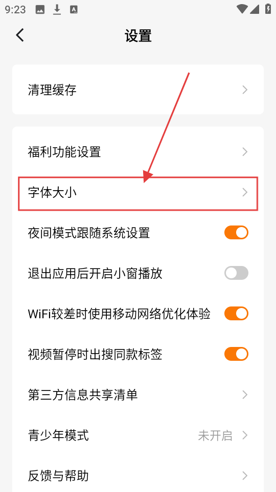 3、在设置页,点击【字体大小】,就能进入字体大小预览页面,选择合适的字体大小。