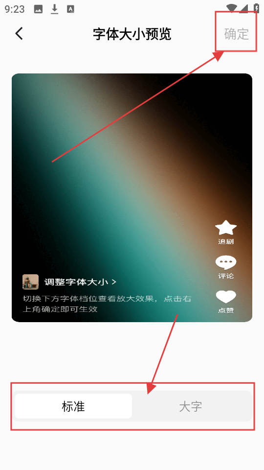 4、在字体大小预览页,选“标准”或“大字”,点击【确定】,就能应用字体大小设置啦。