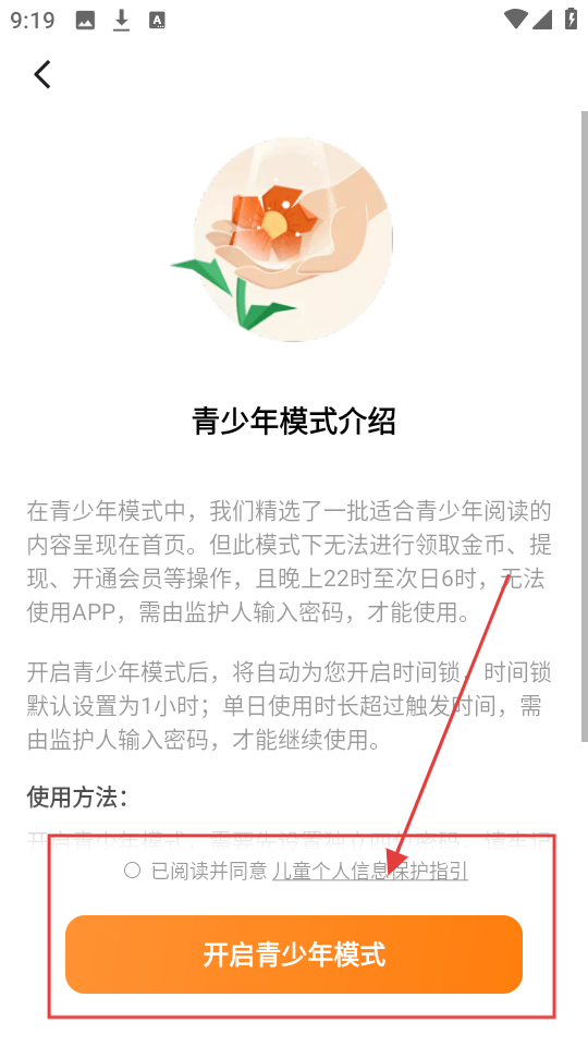 4、在青少年模式介绍页面,勾选已阅读并同意相关指引后,点击【开启青少年模式】,就能开启该模式啦。