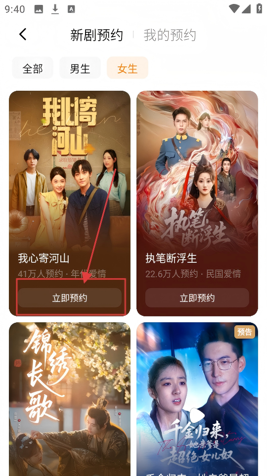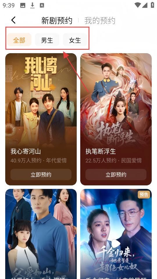 2、新剧预约页面,有【全部】【男生】【女生】分类,选喜欢的分类,找剧更轻松。