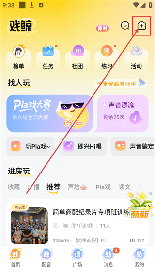 1、在戏鲸首页,点右上角的加号按钮能进入创建房间流程,后续可选择房间模式开启互动啦。