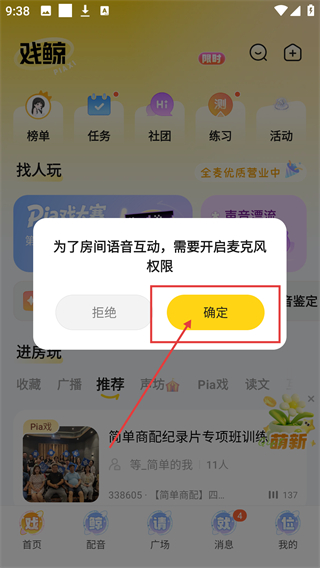 2、触发权限请求后,点【确定】按钮开启麦克风权限,这样就能正常进行房间内的语音互动啦。