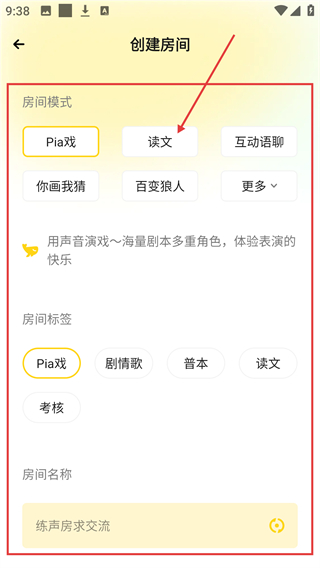 3、进入创建房间页,可选【Pia戏】等房间模式,再选对应标签、填好房间名,就能准备创建房间哦。