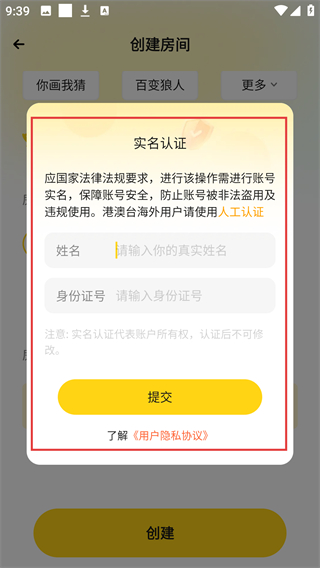 4、创建房间前会弹出实名认证窗口,按要求填姓名和身份证号后点提交,完成认证才能继续创建房间哦。