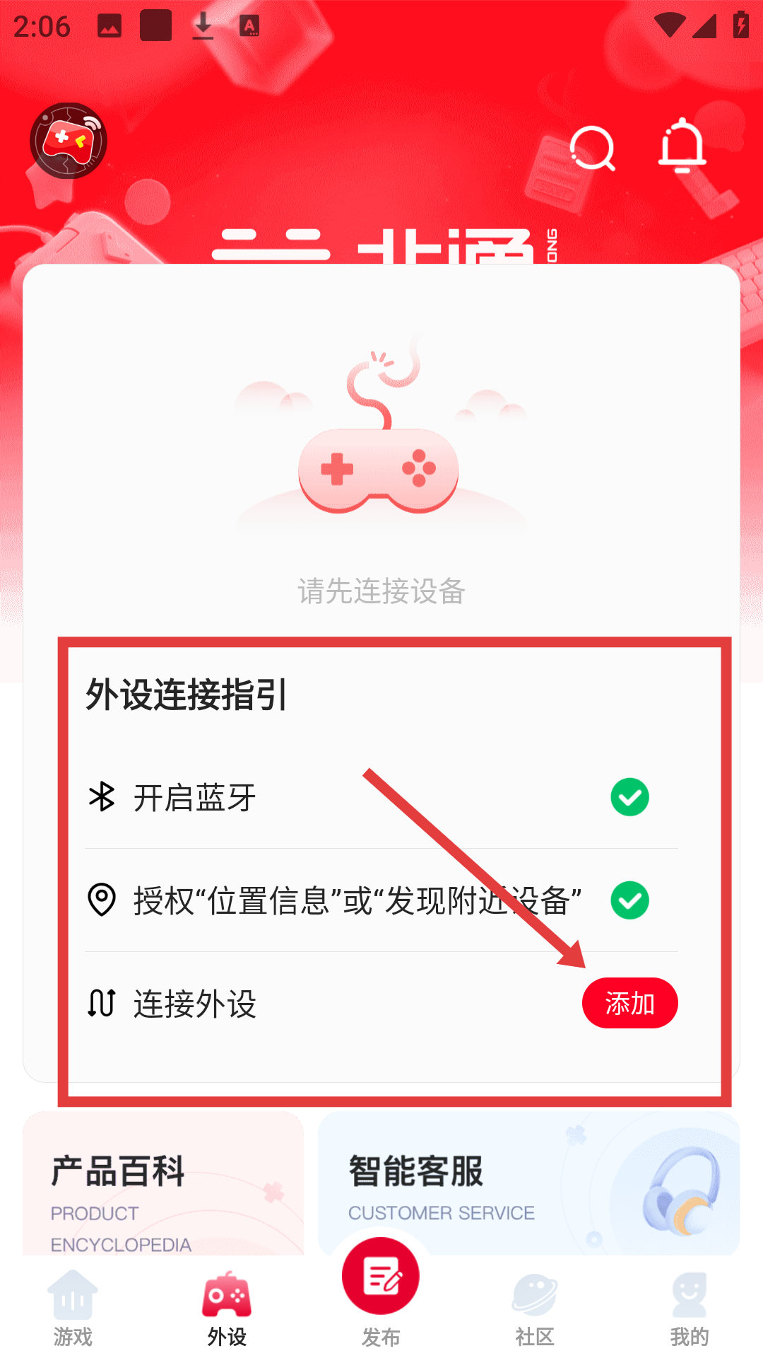 2、进入外设页面后,按照【外设连接指引】完成蓝牙开启、权限授权后,点击【添加】外设啦。