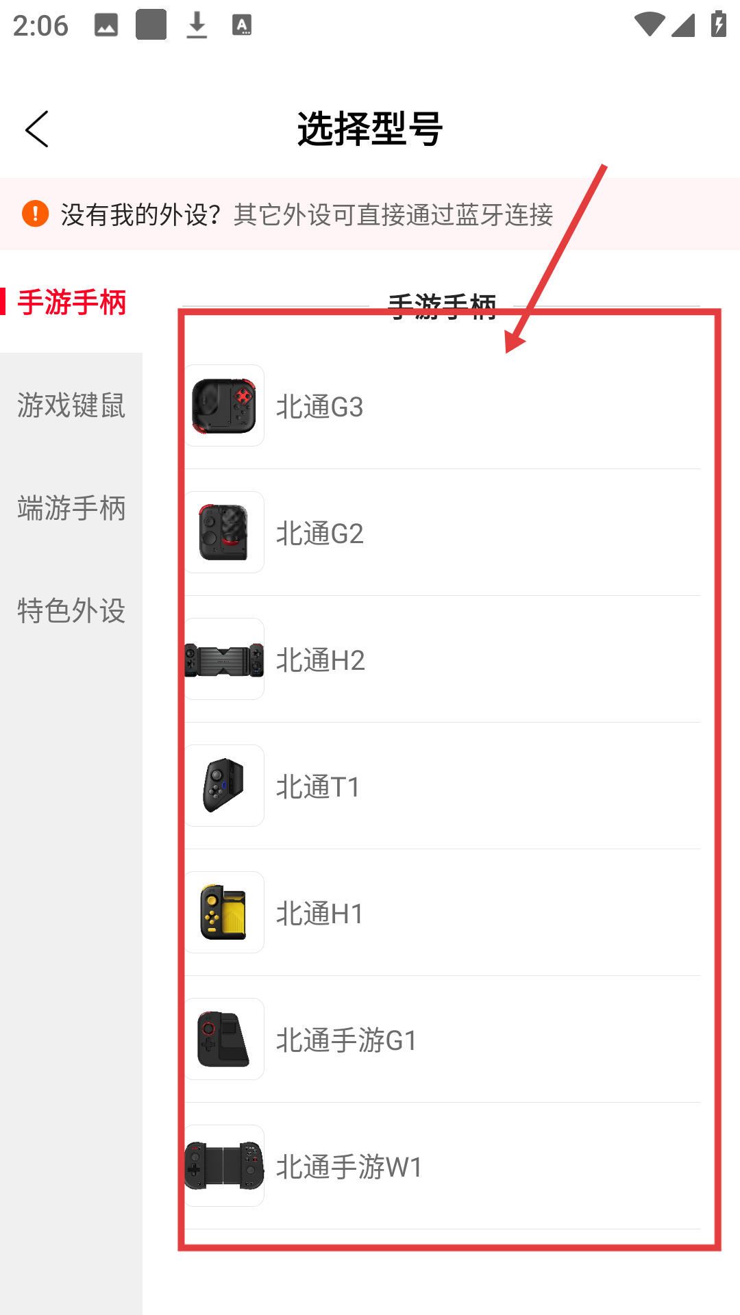 3、在选择型号页面挑选对应的外设型号,比如【北通G3】,点击进入连接页面哦。