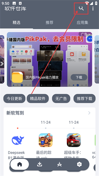 1、在软件仓库首页点右上角搜索按钮,能进入搜索界面,后续可搜想要的软件啦。