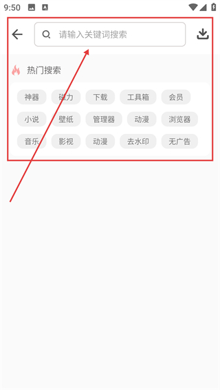 2、进入搜索页后,可在搜索框输关键词,也能点热门搜索里的标签,快速找到对应软件哦。