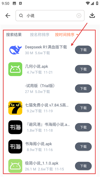 3、搜“小说”后会出现相关软件列表,能按时间排序看结果,选想下载的软件点对应按钮就行啦。